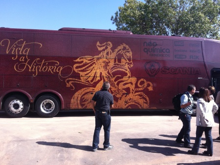 O ônibus do Corinthians foi buscar vereadores e assessores às 9h na Câmara Municipal. Alguns, como Paulo Frange, preferiram ir de carro, mas a maioria dos oito parlamentares que estiveram no encontro desfrutou do conforto do veículo do clube junto de seus pares.